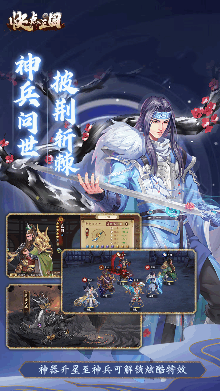 《快点三国》乱世之中,群雄逐鹿。兵戈抢攘,谁主沉浮?《快点三国》定位一款高品质、高策略玩法的三国策略卡牌游戏。惟妙惟肖、精妙绝伦的三国英雄立绘;知才用能、奇诡巧变的英雄阵容搭配;身临史实、寻谋他变的剧情关卡;顺天应时、以策万全的天衍系统;聚英集贤、同谋大事的军团系统;知己知彼、形兵列阵的PVE副本战斗;角逐争霸、问鼎天下的PVP竞技系统。诸如此类,引领玩家体会别开生面的策略三国。