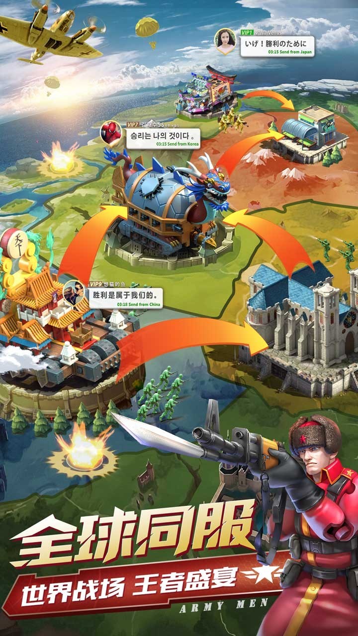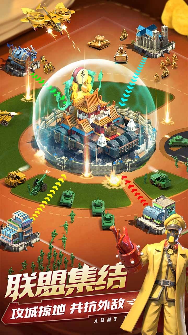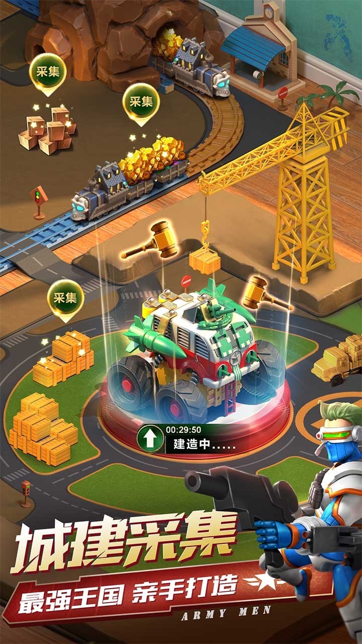 《兵人大战》以多元化的战争策略玩法为核心,玩家可化身为玩具指挥官,统帅三军参与全球同服的火爆战斗,此外,实时的世界联盟混战、庞大的玩具兵科技、海量的军官兵种进阶等精彩玩法尽在这里等你体验,赶快加入绿色兵团的玩具大乱斗之旅吧! 【游戏特色】 1、绿色兵人·经典再临 游戏以绿色兵人的故事为创作蓝本,画面鲜艳明亮充满童真,媲美端游品质,为玩家带来别具一格的战争策略世界。 2、战争策略·玩具帝国 采集玩具资源,发展指挥部基地。联盟指挥部、空军指挥部、坦克营地、科技研究所,打造你的玩具帝国! 3、超能军种·海量收集 多款珍藏版英雄军种帅气来袭,技能装备自由搭配,玩家可全方位打造自己的专属玩具兵团。 4、全球同服·史诗对决 首创无限制跨服PK玩法,随时与全球精英玩家开启跨服战争,想要主宰这个世界,那就用实力来说话! 5、联盟BOSS·等你来战 与联盟成员协同作战,在盟主的指挥下一起来击败集团军BOSS吧,刺激的战斗和丰富的奖励尽在这里。