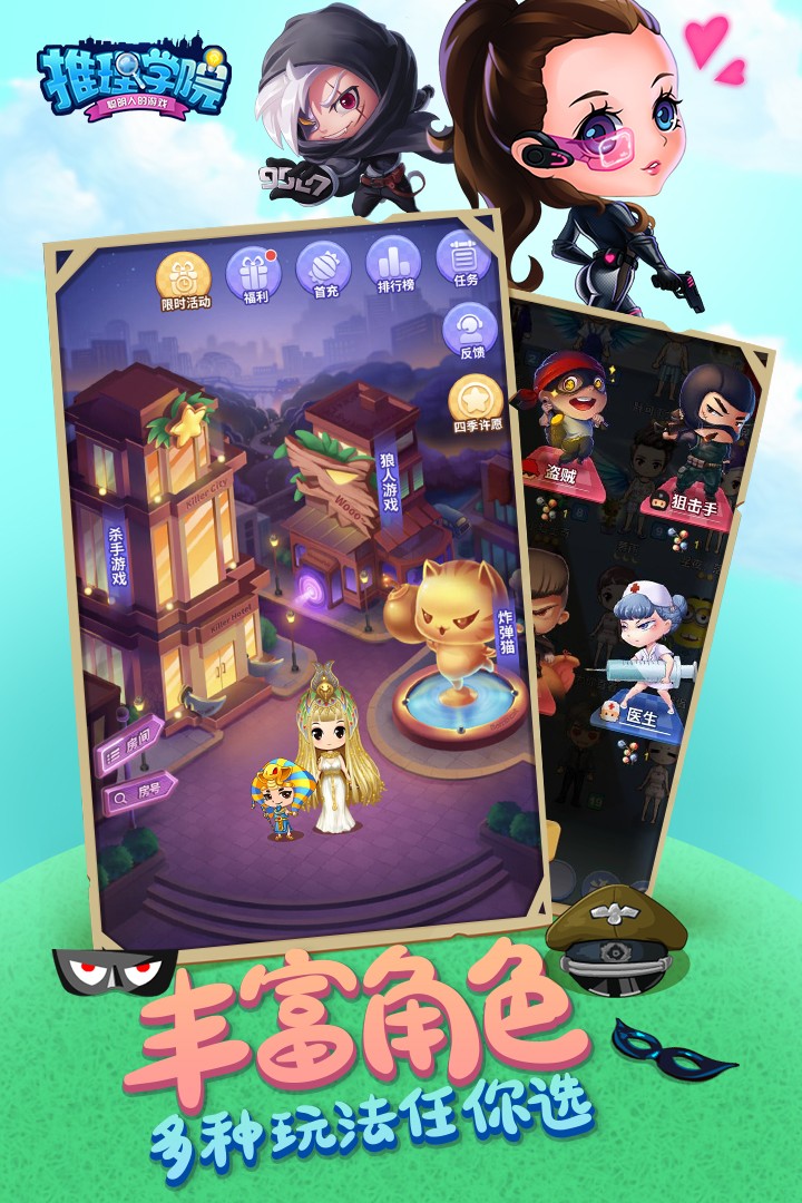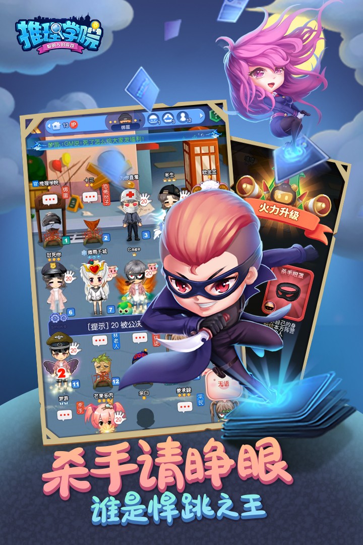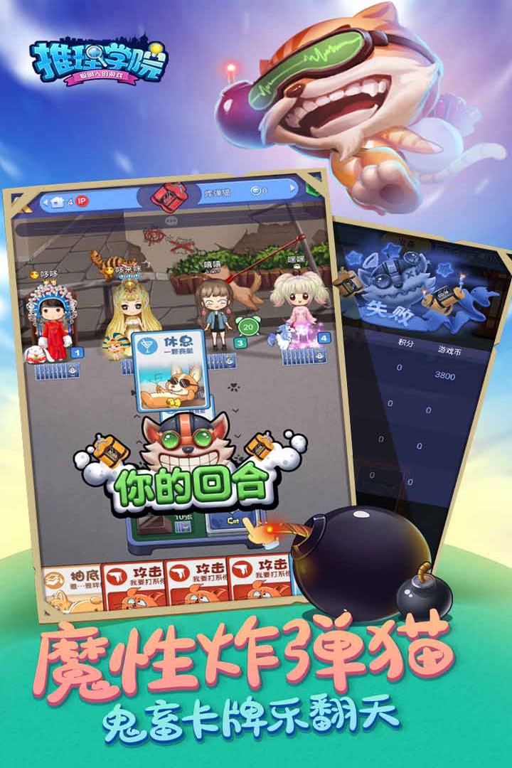 《推理学院》是一款聚会轰趴必备App。多款经典桌游让你和好友决战到天亮。一个人在家也能玩桌游,在线多人面杀,边玩边聊激情悍跳。独创“火力升级”随机事件,让游戏更加有趣。推理杀人游戏现已扩展十个游戏版本,三大阵营,22职业。更有新式卡牌桌游“贪吃狼”、魔性“炸弹猫”,经典烧脑狼人游戏。你可以在游戏中交友、拜师收徒、创建或加入家族、以及和萌妹帅哥步入婚姻殿堂。
