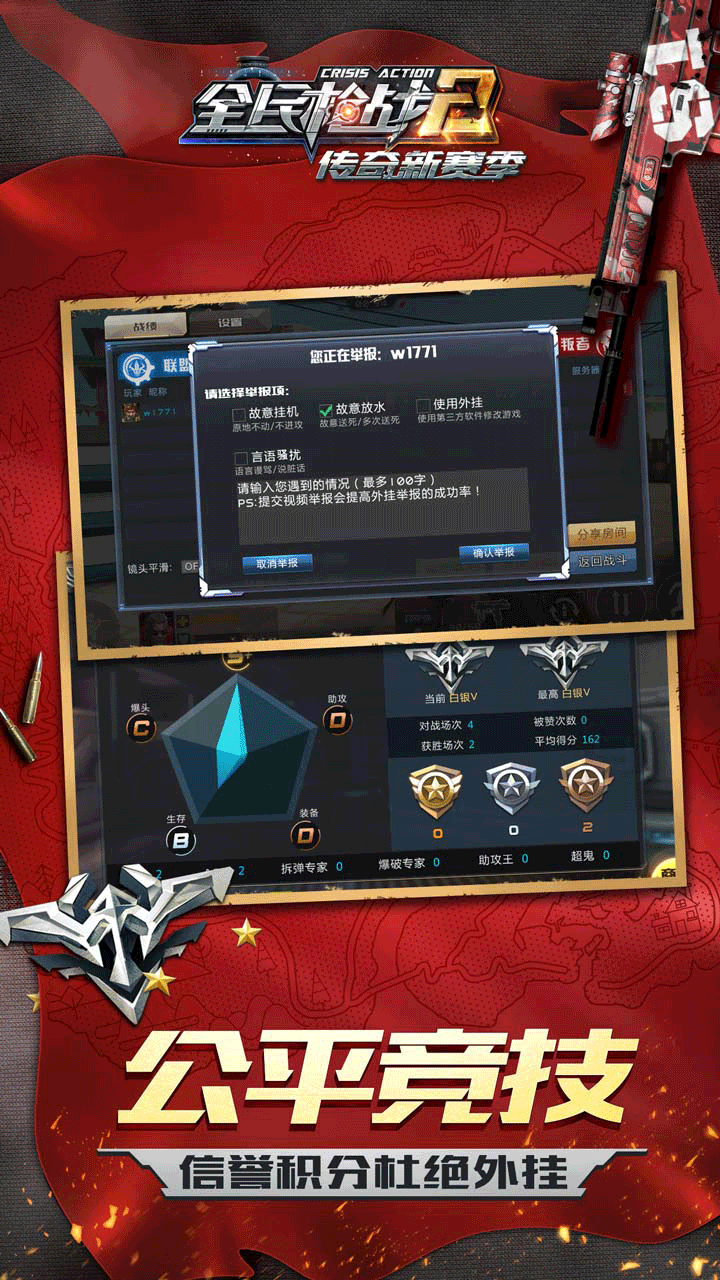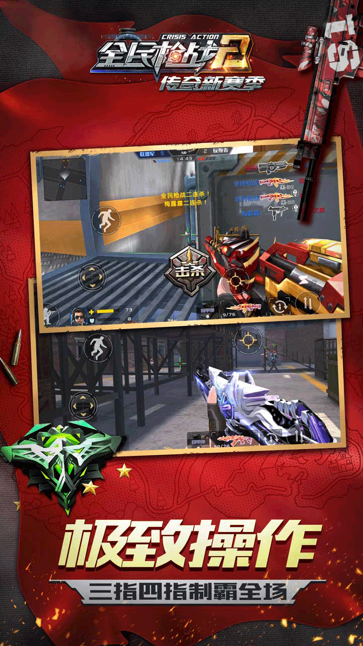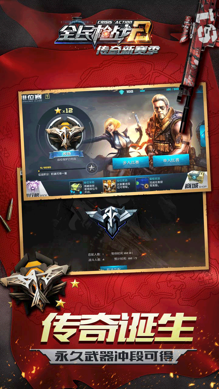 《全民枪战2》是英雄互娱研发的全球首款FPS+UGC竞技手游。新版本-传奇新赛季,排位系统全面升级,新增传奇段位!更有全新排位商城火爆上线,永久枪械0元可得!全新信誉积分体系,只为打造绿色竞技环境!让玩家玩的舒心,排位更爽!更多好玩又有趣的内容等你来游戏中发现噢!喊着兄弟好友一起痛快开黑吧!