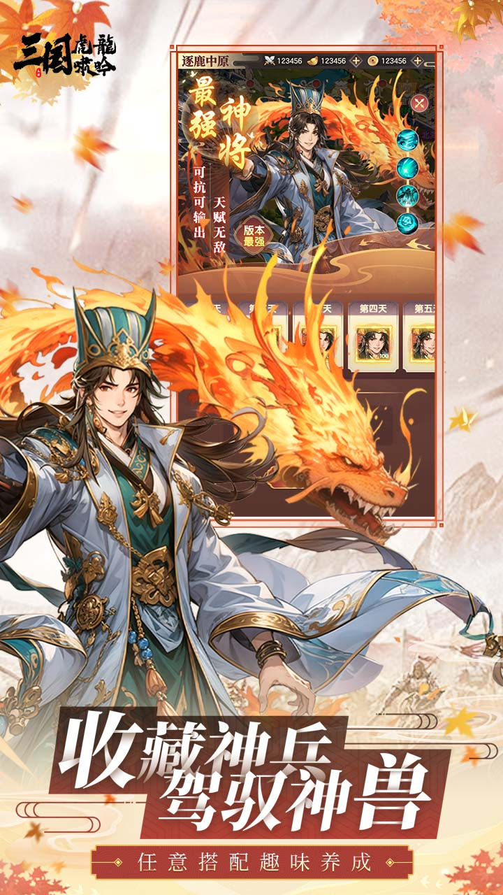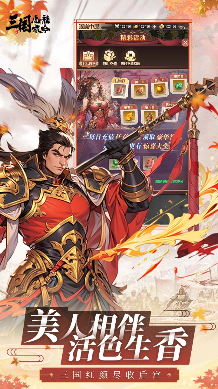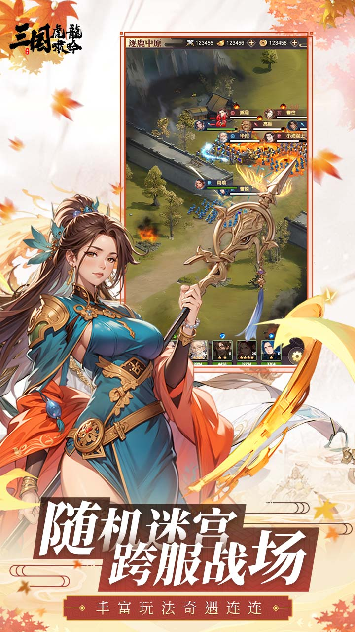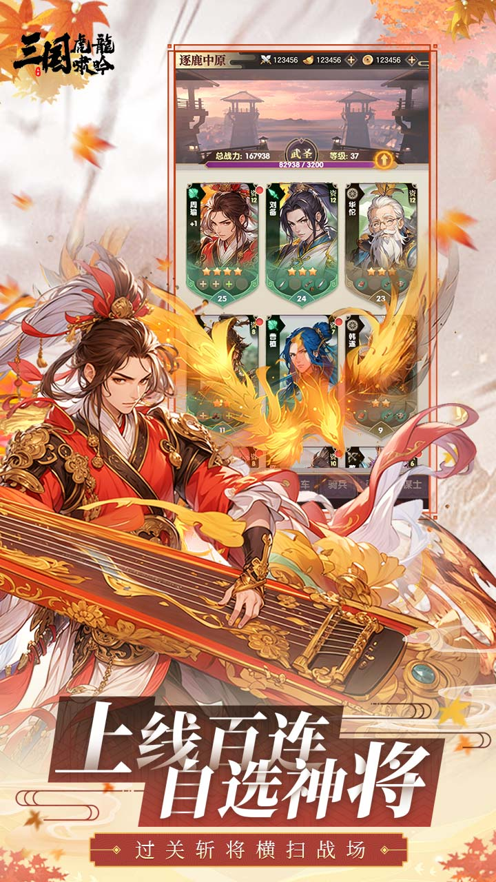 《三国虎啸龙吟》是一款三国放置卡牌手游。玩家将化身诸侯,率领千万兵马征战各路强敌,还原经典狼烟战场,全天无限制自由国战,每一座城池均可争夺,发展内政、招募将领、封地建设、巅峰对决,想要成为三国最强霸主吗?赶快放马来战吧!