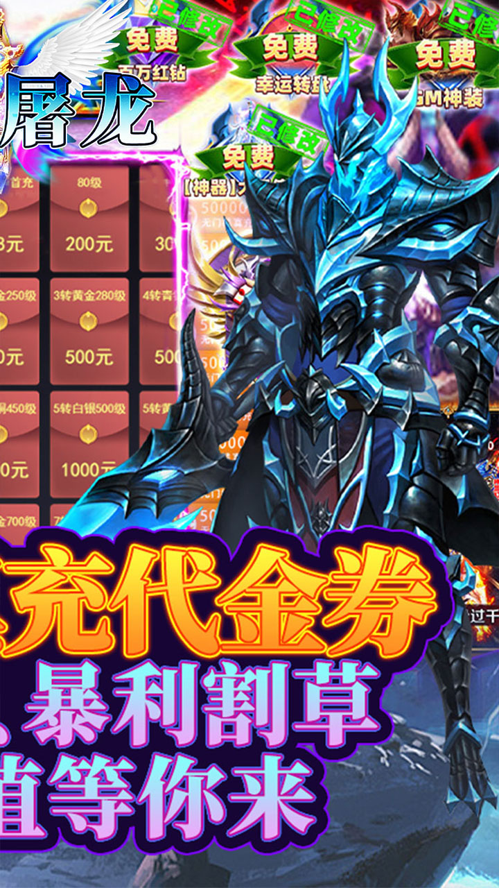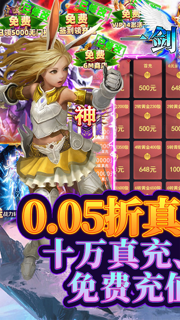 4档:累计充值200000元(实际金额1000元):蓝翎剑*2、金色魔法箱*2、7级恶魔宝石*2、7级圣灵宝石*2