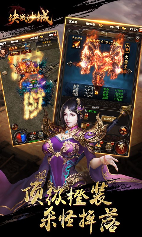 经典东方魔幻传奇手游——《决战沙城》来袭,一起重温经典!写实画面,原汁原味经典重现!呼朋唤友,和兄弟一起铸就辉煌!即时PK,媲美PC端游体验!万人攻城,风云再起! 战斗!靠装备,更靠技术!打造最强帮会!兄弟!无兄弟不热血!一起铸就辉煌!神装!专属套装霸气附体!外观拉风属性爆炸!经典传奇角色,战士,法师,道士,大招再现!和兄弟共赴沙场,轻松打怪!和公会兄弟一起闯天下,打出一片属于你的传奇!