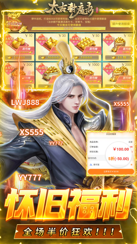 实付单日充值10000元:太上老君印*8、麒麟战纹*8、高级披风精华*30、高级仙翼精华*30、爱情结晶*500