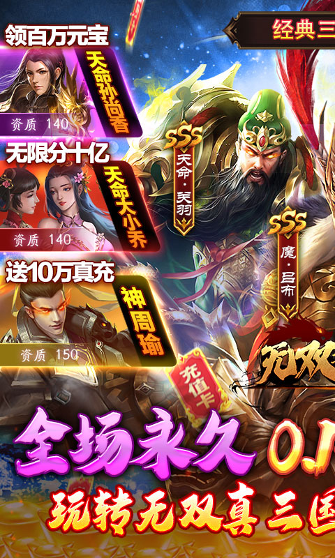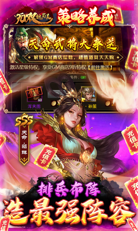 2023年度最佳三国卡牌0.1折手游《无双魏蜀吴》震撼来袭,超高福利超爽战斗倍速,给你不一样的游戏体验。登录即送GM1,超级GM资源包,200万元宝,千万铜钱!全新版本升级豪送20万元真充卡,并且真充卡可以解锁GM商城。不仅如此,还有全新策划独创新玩法超级宝藏,内含十亿元宝!而且奖池不间断,可无限瓜分十亿元宝!登录7天免费领取5星神将关羽,每天领100连抽,各类资源应有尽有!让主公在游戏中尽情体验,招兵买马,带领众多名将征战四方,结交天下英雄的快感!还有机会与当世美人结缘,一统天下功成名就。游戏完美还原了三国战争场景,权谋战略之间的较量,风起云涌,号角吹响,率领大军参与国战,攻城略地,在战乱中建立自己的势力,定天下以安民心。