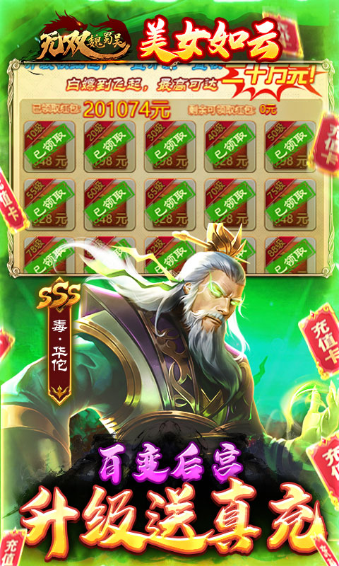 6.充值比例1:5000,1毛首充领神将吕布,次日领吕布神器方天画戟,三天领美女貂蝉,枭雄美人配神器,三国大地任意闯。