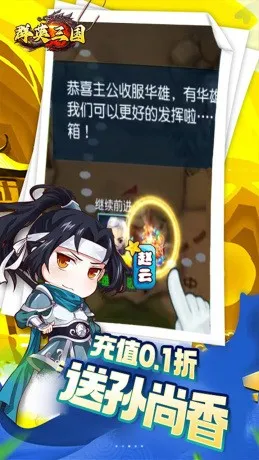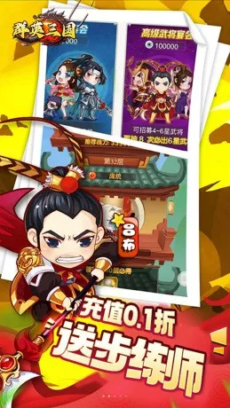 这是一款时空穿越模拟养成类卡牌手游作品,让玩家穿越三国做主公,结交天下豪杰。个性鲜明的时装,国风古韵的场景,绚丽多彩的技能,让你爱不释手;回合策略的对战,穿越到到战场点兵,排兵布阵的三国乱世;属性各异的武将自由搭配,打造属于自己的“三国战队”!这是一个烽烟四起,群雄逐鹿的年代,这是一个上兵伐谋决胜千里的世界,这更是一个英雄辈出,名将如云的时代。国色天香貂蝉、战神无敌吕布、七进七出赵云、万夫不当之勇的关羽将英雄美人尽收帐下,一起谱写不朽传奇。萌将无双 名将养成,颜值和实力并存超萌Q版粘土人,怪蜀黍、御姐、软妹子轮番登场,陪你征战天下! 一骑当先 虎牢争霸,实时PVP乱斗 实时PK,面对面战斗