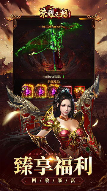 《荣耀之怒》是一款传承经典战法道三职业的传奇游戏,细腻真实的游戏画面给玩家带来无与伦比的游戏体验,不仅有海量boss随便刷,还有跨服攻城、跨服战场等多种pvp玩法让玩家激情对战。每天上线送充值,真金白银到手里,海量灵符玩就有,随便扫货不用愁,满地boss随你劈,全部都能爆红装。自动挂机,轻松不累,不肝不氪,想玩就玩。