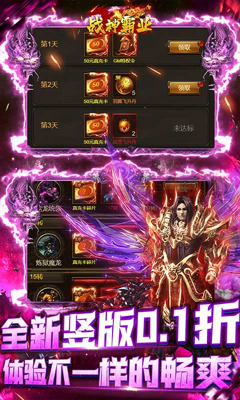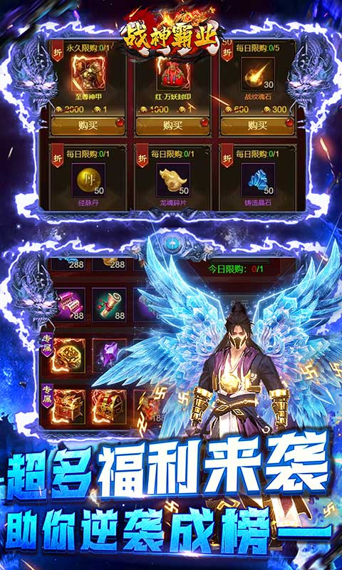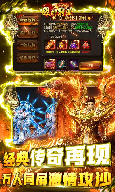 战神霸业是一款承载着无数80后传奇记忆的挂机类传奇游戏。游戏独创第四职业魔神,上线送万元充值卡登陆就送,更有每日登录领取真充卡,零元党也可以玩的很开心!游戏不但还原了经典的传奇特色,更加入了一些创新元素!让您和您的那些兄弟驰骋沙城,称霸全服!