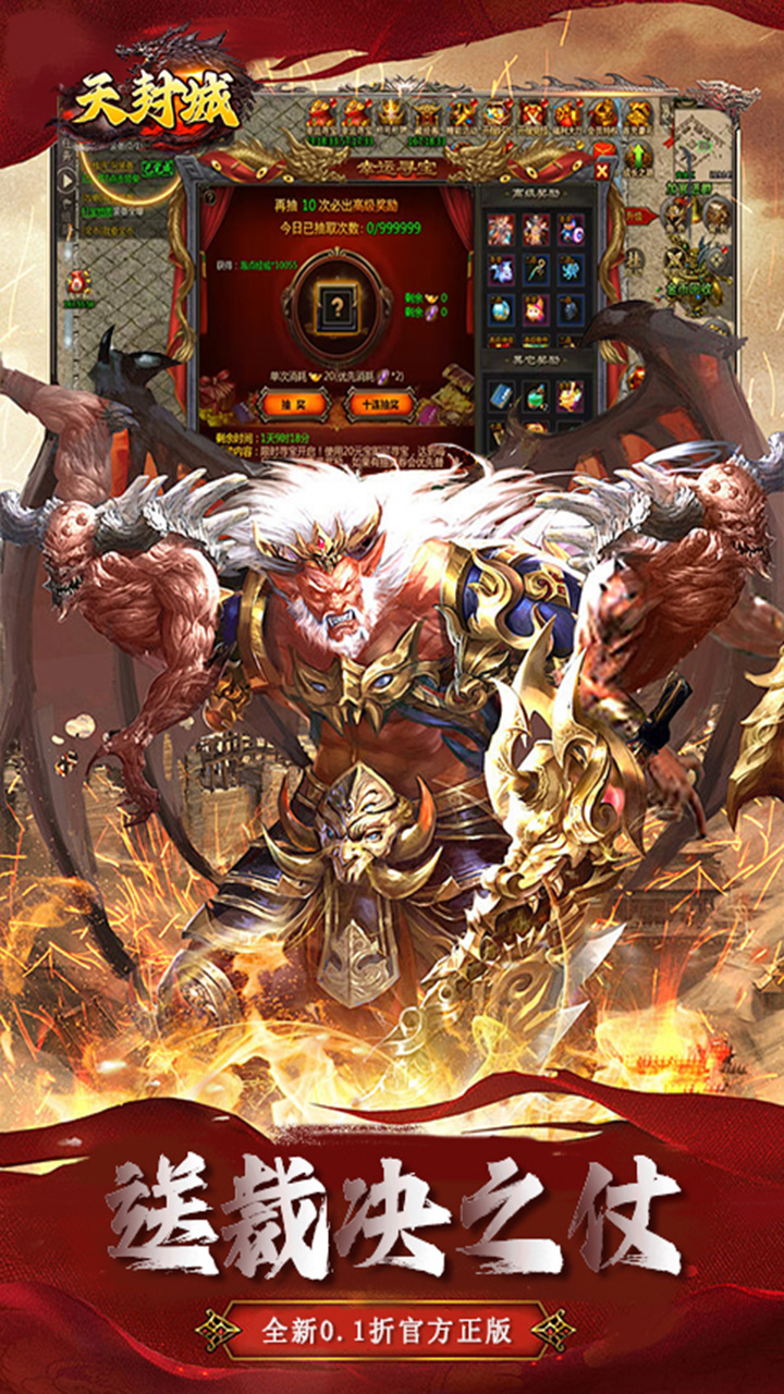永久累充20000元:混沌圣魔*1、兵甲结晶*1200、基队长7天*3、高转自选礼包*35、天之散件自选箱*1、陨铁*1500、生肖碎片*1000、珍宝碎片*100、冠龙龙魂*500、金龙龙魂*500、多倍经验瓶*500、神魔保险888*3、四象朱雀丹*30000、四象玄武丹*30000、金条*150