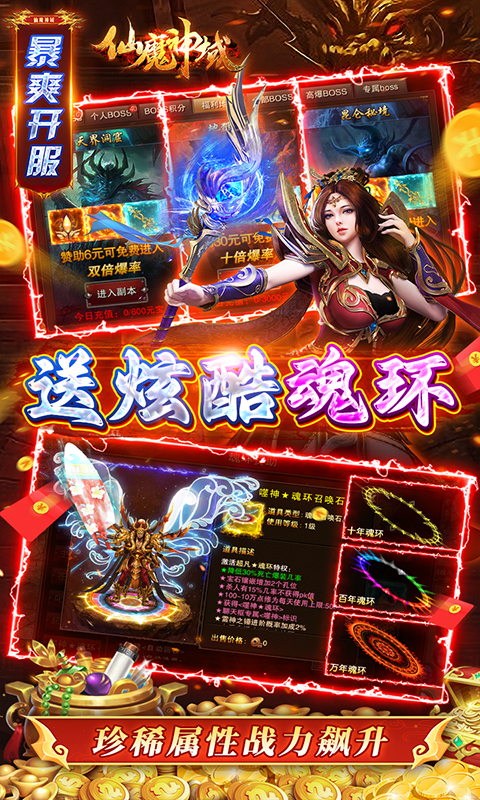 《仙魔神域》全部充值永久0.1折!上线送战狂魂环、38888绑元、10亿绑金。累计登录送苍月法神,超强群攻刷怪无压。在线领经验珠、修为丹,升级转生无忧!激情百倍爆率,万物皆可爆,刀刀暴击,光柱满屏!