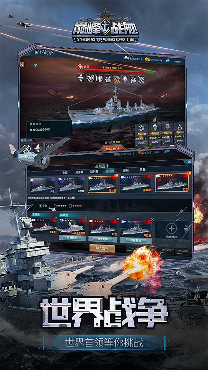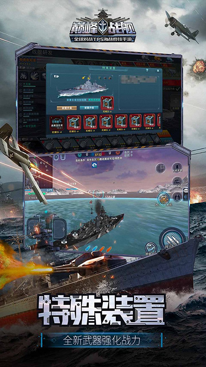 次世代TPS海战手游《巅峰战舰》主打10V10真人天梯实时对战和PVE激情战役副本。游戏当前开放中苏美日英德等十余系,三百余艘战舰,包括驱逐,战列,潜艇,巡洋、航母等5大舰种,实现海空潜立体化作战!快来加入相应阵营,进行天梯、常规、战役、乱斗等多种模式的战斗。