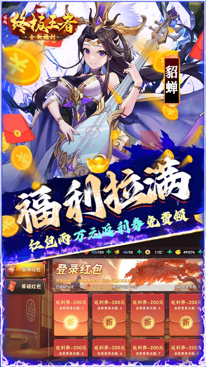 SSS武将碎片任选*150、元宝*20000、红装任选宝箱*1、极品精炼石*200、培养丹*1000、命魂*10000、7级宝石宝箱*1、高级返利抽奖券*1