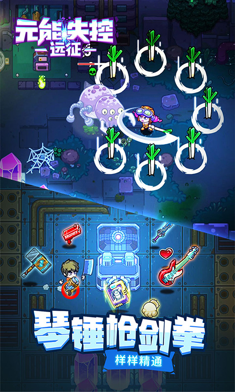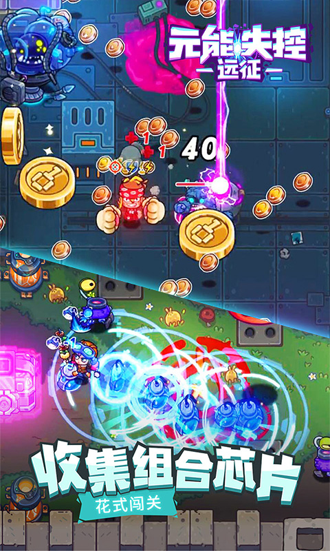 《元能失控:远征》作为《元能失控》系列的衍生产品,是一款Roguelike元素的联机冒险手游。玩家在风格迥异且危机四伏的星球上,解锁英雄,升级天赋,提升战力,收集芯片,用各种各样的花式武器去战胜来自各个时空的怪物,体验节奏快速、酣畅淋漓的战斗!