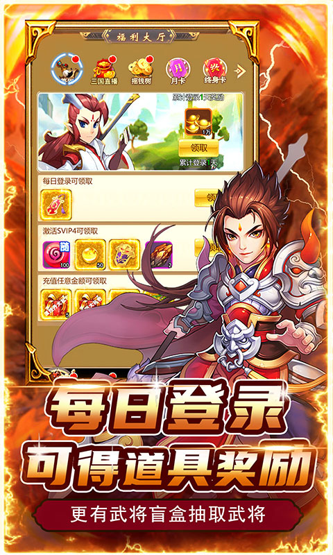 折后累计充值5000元:无敌张飞*1、武圣关羽*1、蛮将盲盒*20、属性丹大礼包*5000、丹药大礼包*500