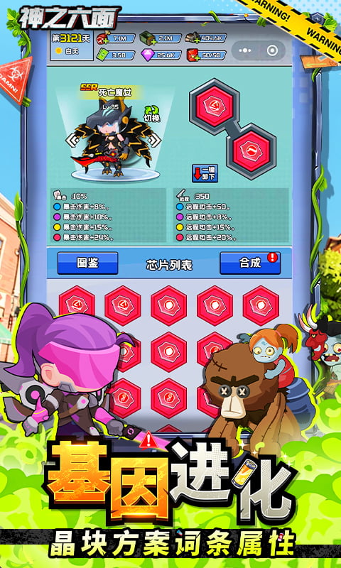 《神之六面》是一款末日题材的冒险生存Roguelike手游。在不远的未来,人类世界被突如其来的僵尸病毒所侵袭,僵尸浩劫将文明推向崩溃的边缘,希望之火摇曳欲熄。玩家将扮演一位末日幸存者,挺身而出,率领伙伴团队在危机四伏的废墟中踏上求生之路。游戏中,玩家需要不断升级角色、强化装备、进化基因和研究卡牌,提升每位幸存者的战斗能力,构建独一无二的战术体系。玩家在混沌战场中灵活走位、自动锁定并持续攻击汹涌而来的僵尸狂潮,在险恶环境中集结小队、规划战术和收集资源,以在末日的夹缝中顽强生存。