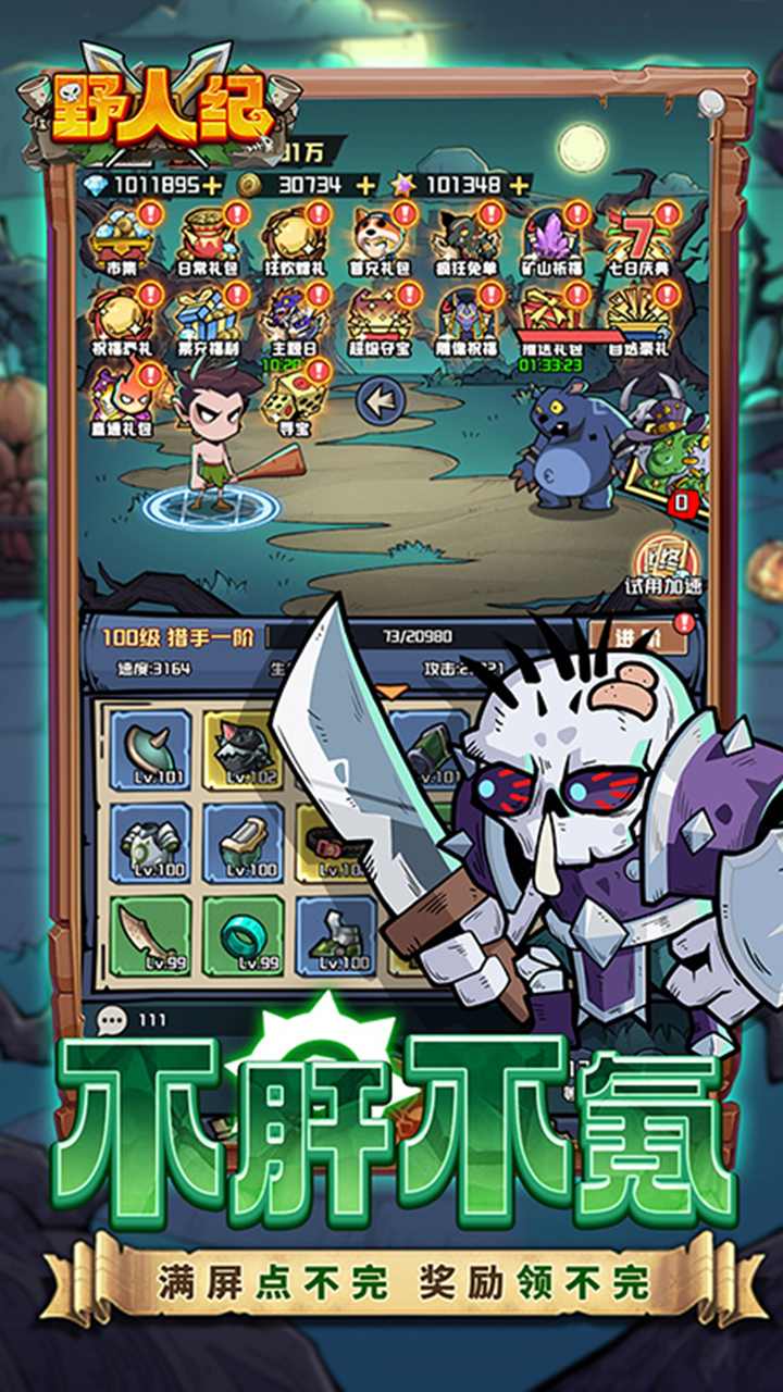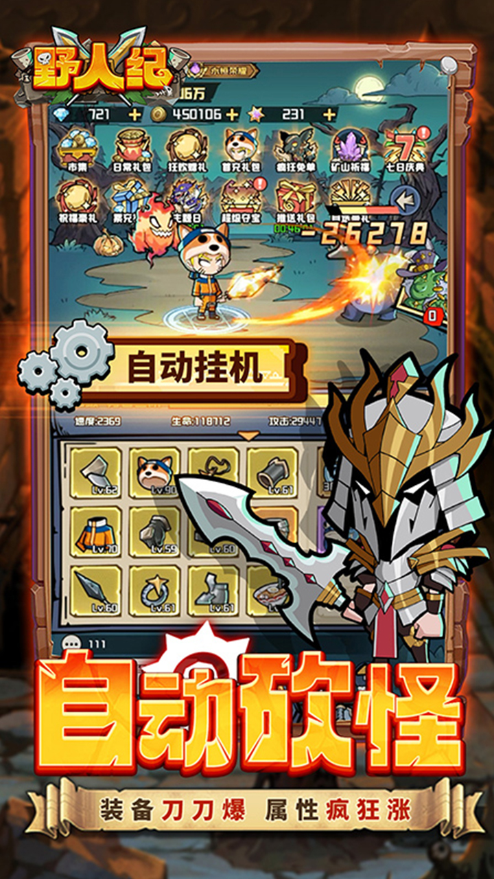 《野人纪》是一款魔幻题材的放置开箱类游戏,在游戏里通过不断砍怪爆出各种装备,对于热衷刷装备的玩家可以体验到什么叫高爆,还有超多养成提升战力,丰富玩法畅爽游戏,更有全新自由搭配系统在策略中完成逆袭。