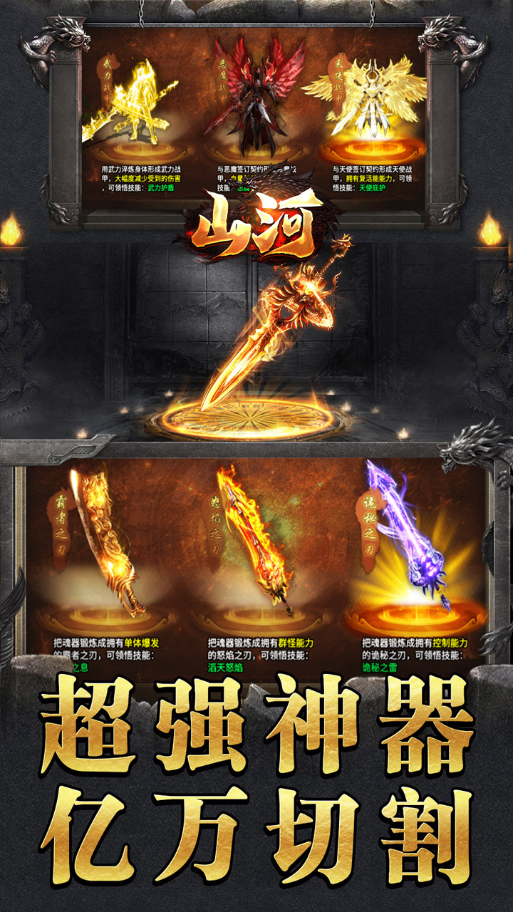 《山河》是一款福利拉满的传奇手游,在游戏中我们加入了超多的丰富福利,还有多样的地图、专属神器、加速装备、鞭尸神器、炫酷光柱、免费礼包、超多活动一定让您玩的爽快!