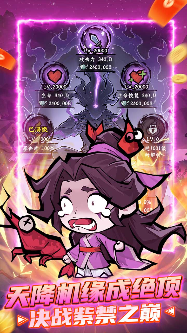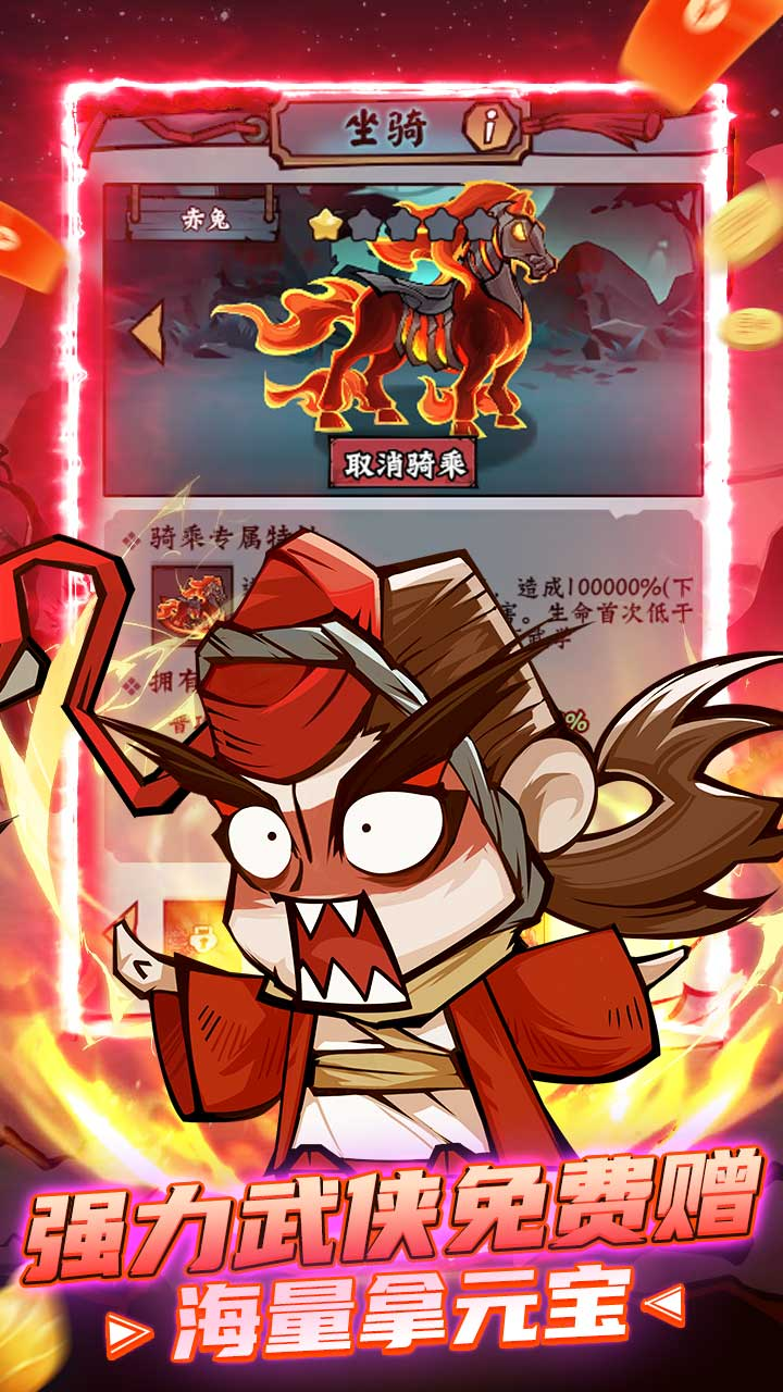 来这片江湖享受不一样的爆爽体验 炼百种秘籍,身骑赤兔马,踏七彩祥云也不过这个数? 在这里 你会穿越到一个无厘头的武侠世界里,游戏提供了多种职业选择,玩家可以根据自己的喜好选择职业,定制独特的角色外观,创建一个独一无二的角色,扮演不同的高手侠客,驯化传世神宠跟随自己行走江湖,惩恶扬善,当然你还可以加入或者创建一个帮派,到时候是拳打大佬,还是脚踢第一就看大侠你的本事啦!