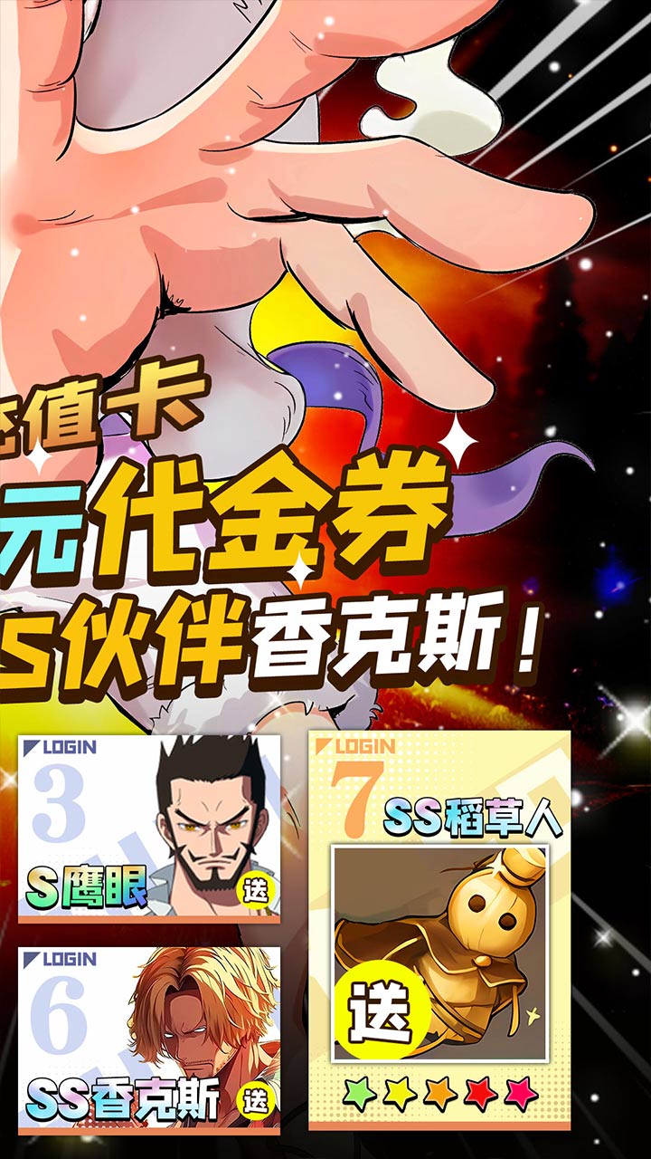 七日奖活动可获得S级伙伴:艾斯、大熊、鹰眼,SS级伙伴:大船长巴基、汉库克、香克斯,以及近万元充值卡