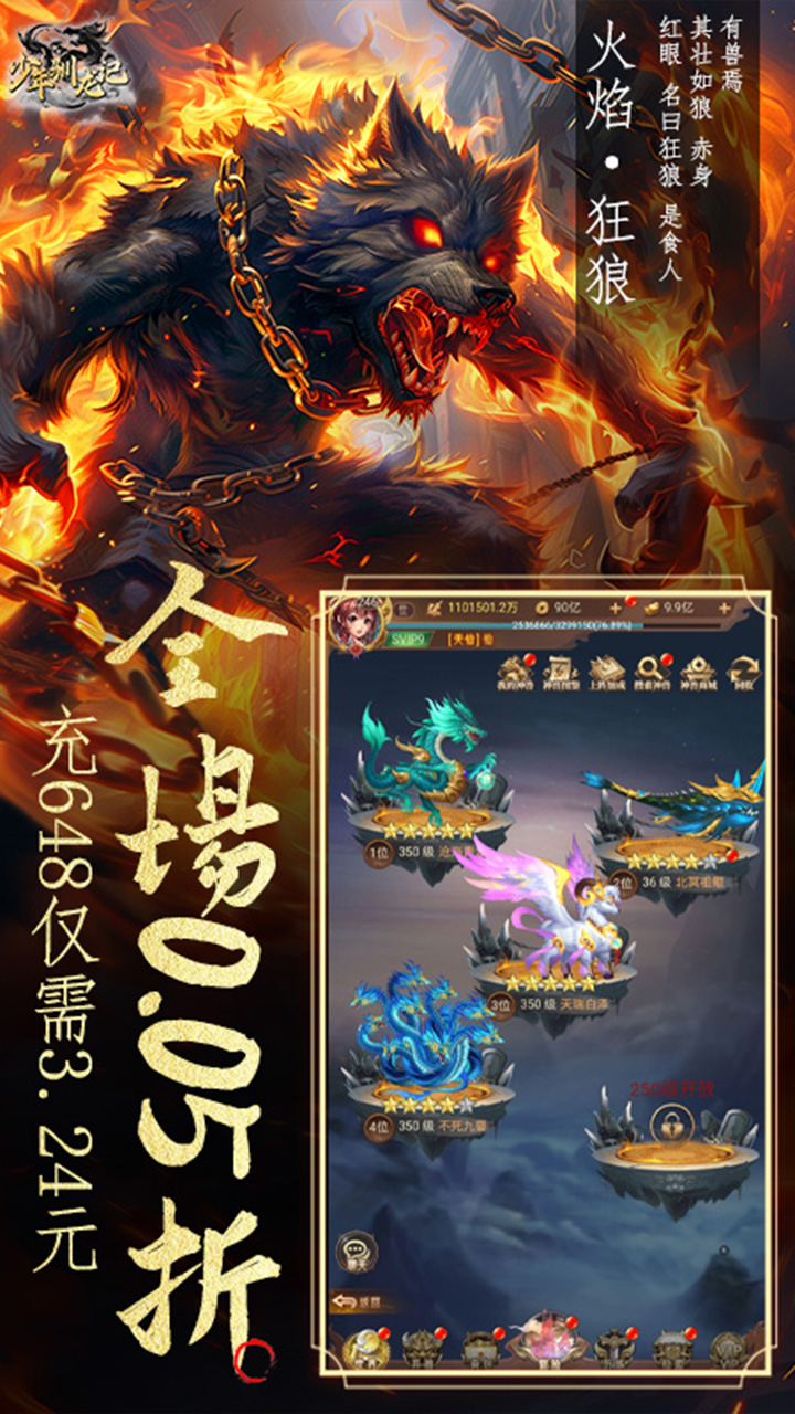永久累充3000元:SP异兽任选*1;金色仙侣碎片任选礼包*10;雷霆结晶*50;战宠召唤符*100;战宠属性丹 * 10