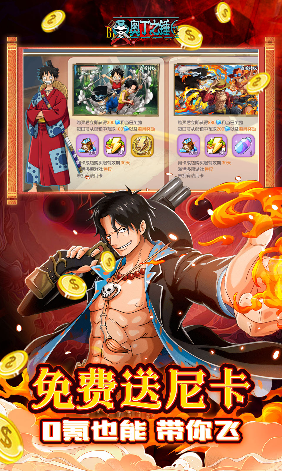 冠名礼包:区服永久冠名权、暗金伙伴--尼卡路飞*1,橙色携带道具宝箱*1