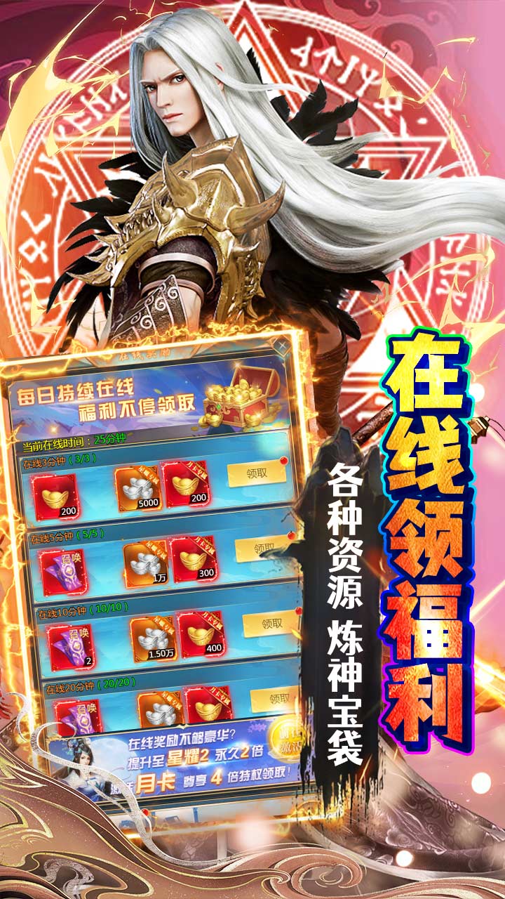 永久累充20元:1亿经验丹*1、开天秘宝匣*1、神兵凝光*1