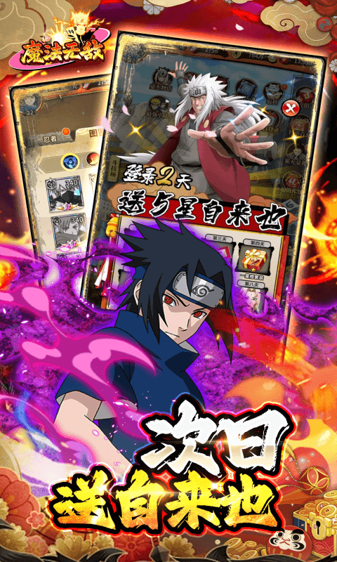 冠名礼包:上忍结印卷轴 * 1、三星红套装 * 1、五星超稀有自选卡 * 1、4星究极传承组合兑换券 * 1