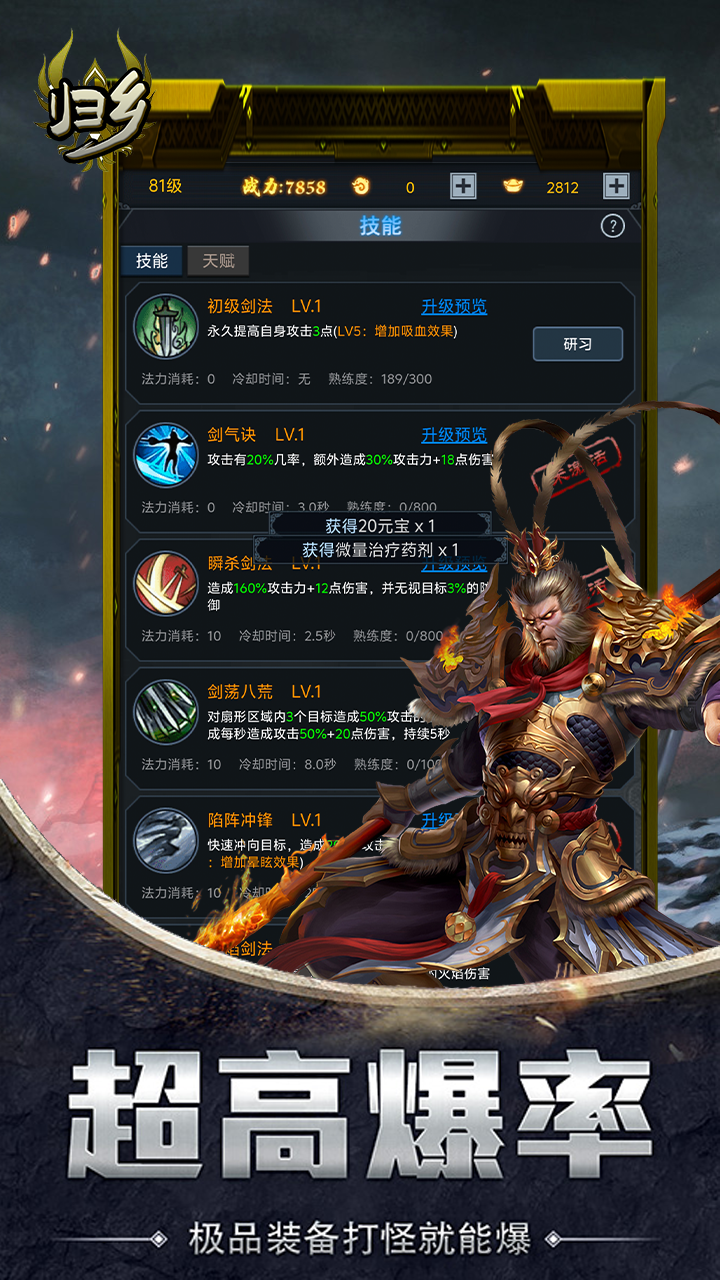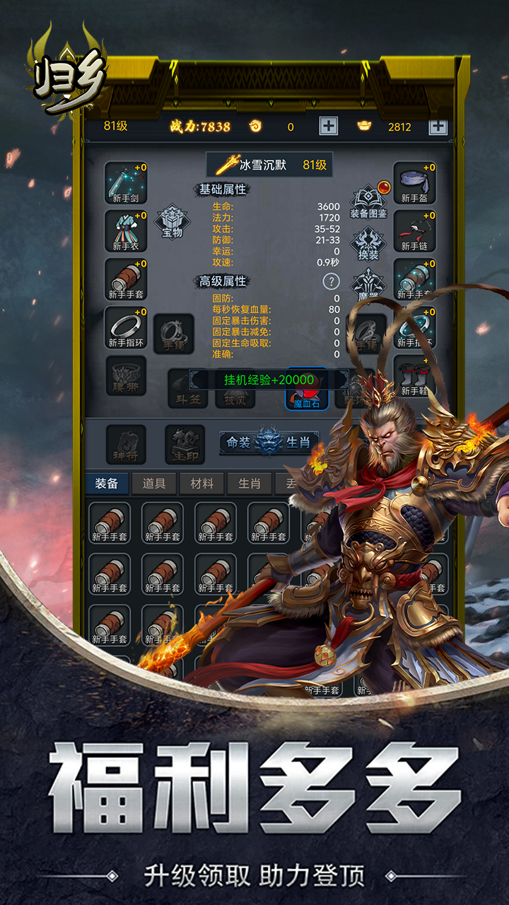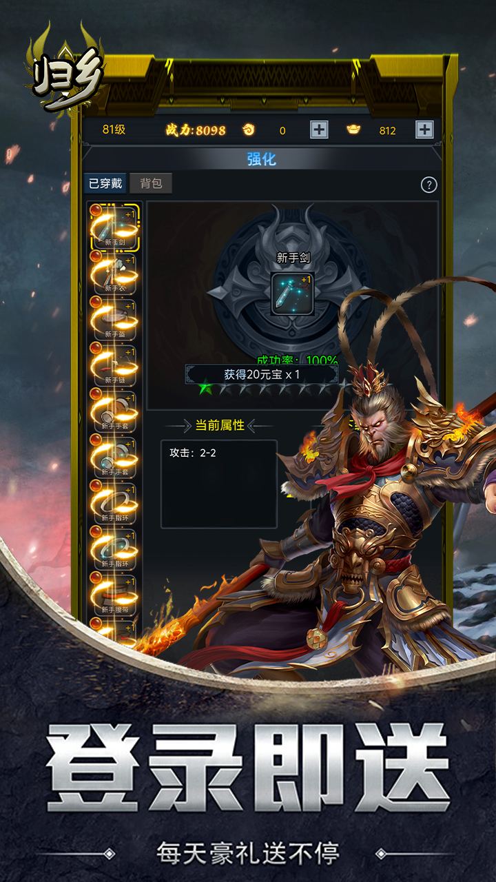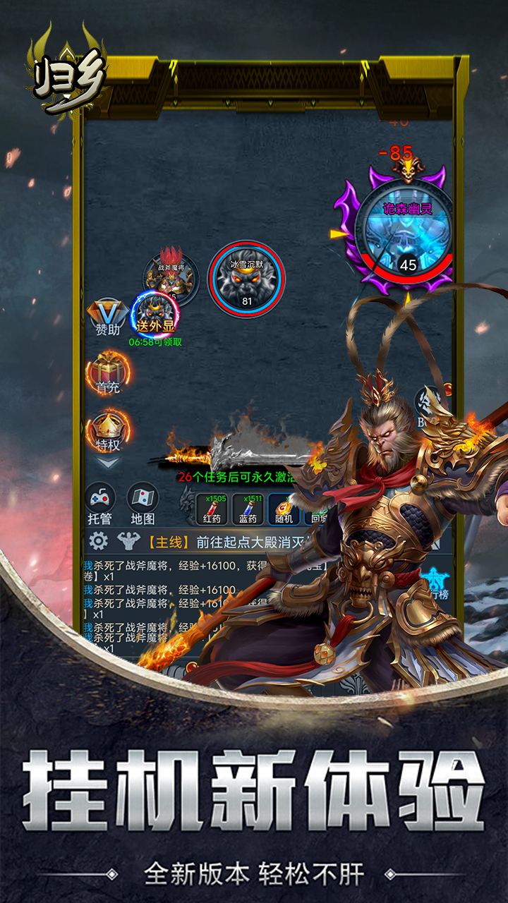 《归乡》是一款以放置类RPG文字挂机为核心玩法的游戏,提供了丰富多样的BOSS战斗体验,让玩家沉浸在不断挑战与征服BOSS的乐趣中。游戏中的所有装备都可以通过打怪获得,无需GM干预,玩家可以自由搭配神器和魔器,即便是小怪也有可能掉落顶级装备,为玩家提供广泛的装备选择和搭配乐趣。