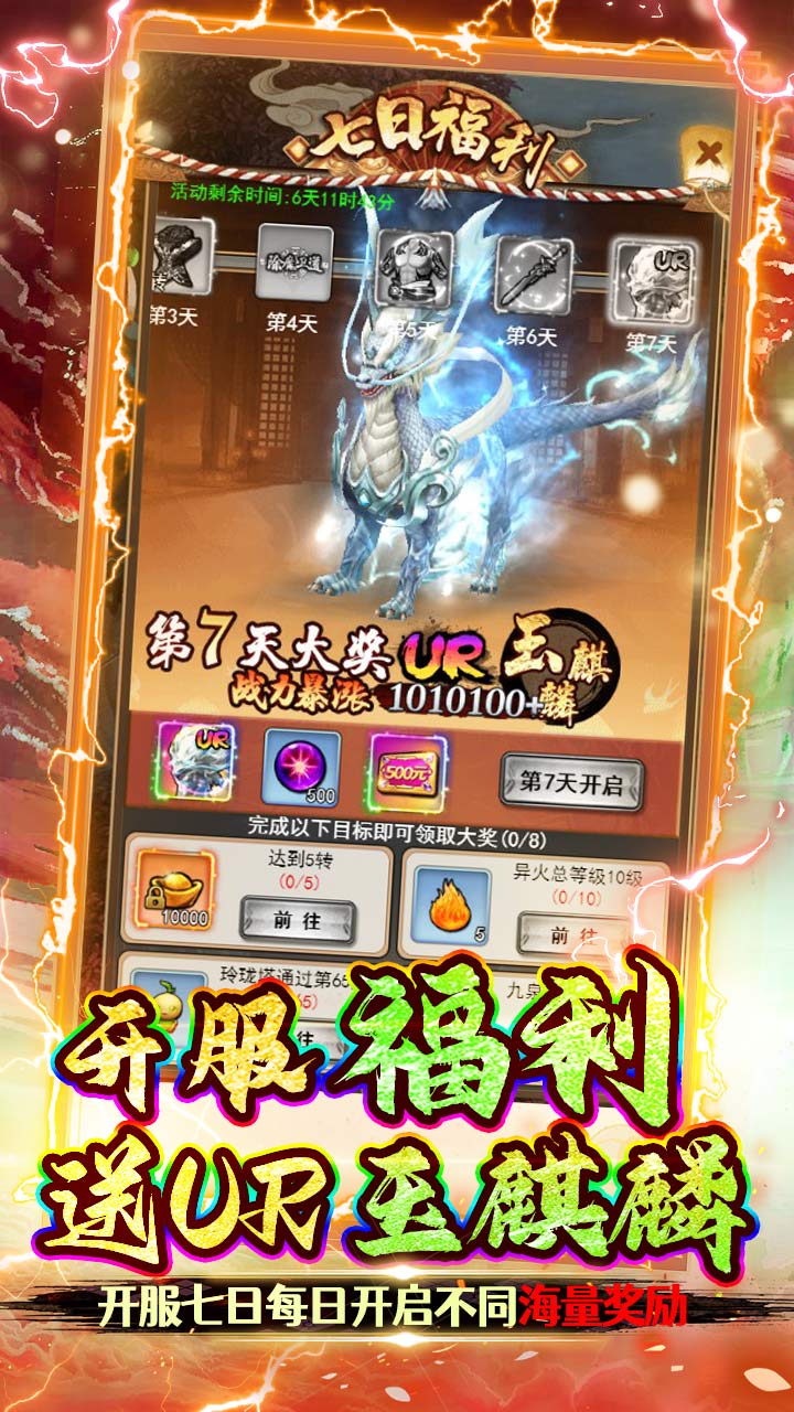 永久单日6000元:PR异兽自选蛋*10、UR兽魂*12、神装碎片*1200、进阶属性丹礼包*1200