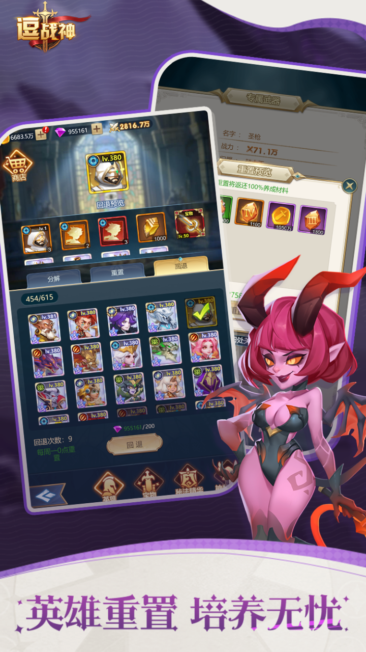 可选Ss英雄*20,高级召唤*500,奇迹召唤*50,红色素体卡*30,金色素体卡*30,进阶石*6w,进化石*6w,2小时金币经验*1000,T石自选*20,战神*6,战争女神*6