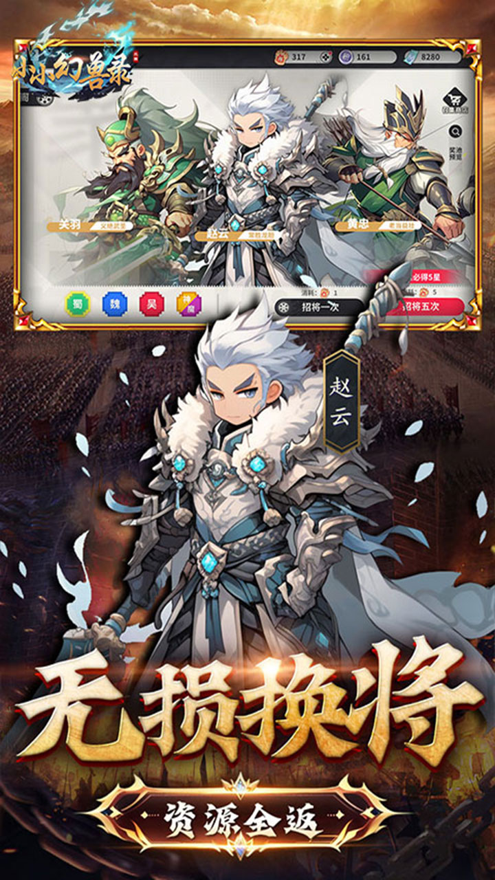 在游戏中,玩家将穿越回到三国时期,扮演一位智勇双全的主公,与历史上著名的战略家和勇猛的武将们并肩作战。你需要收集不同的武将卡牌,通过合理的搭配,配合强大的神器灵宠等系统,组成超强的阵容。每张卡牌的属性和技能各不相同,玩家可以根据自己的战术喜好进行选择,制定独特的策略组合。除了卡牌搭配,还有各种战役副本和挑战等待着玩家去完成,通过战胜敌人,提升自己的排名和声望。 本游戏采用了精美国漫的画面风格,每一个战斗场景都充满了震撼力和视觉享受。还精心打磨了角色形象和细节,让玩家能够感受到历史上伟大将领的英勇和智慧。如果你是一个喜欢策略游戏和历史文化的爱好者,那么这将会带给你前所未有的游戏体验。快来组建属于自己的三国强大阵容,征服敌人,成为真正的三国霸主!