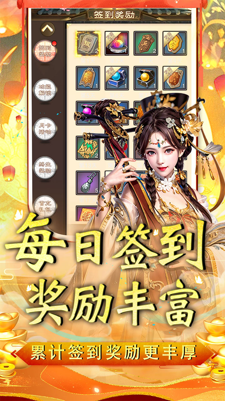 ##活力丹*500、天书礼包*20000、指环*20000、项链*20000、属性道书*2000、绝技礼盒*2000、人皇三件套*1