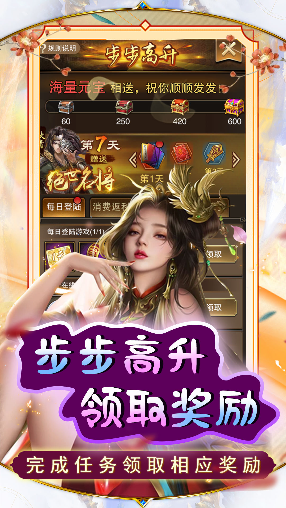 活动规则:活动为单日累充活动,根据单日充值额度领取道具(如单日充值6000元则可领取5000元档位+1000元档位),高档位不可领取低档位奖励。