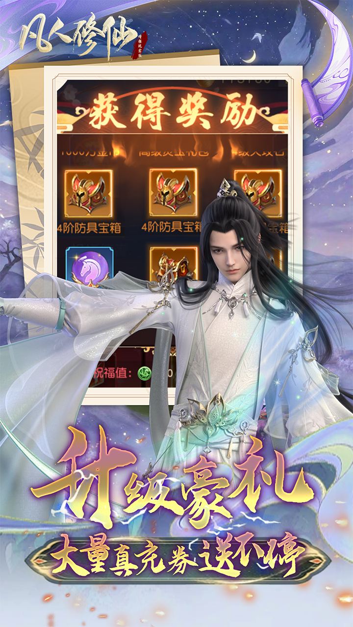 13阶金色三星防具选择*1、恶魔*1、紫霄雷电蛟*1、天明师兄*100、炼气之海次数卷轴*4、超凡寻宝令*188、9级宝石宝箱*3、5倍经验药水*6、超凡升级丹*3