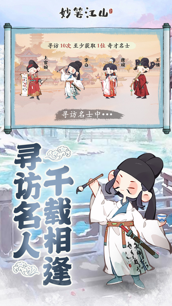 《妙笔江山》是一款以中国诗词文化为题材的角色扮演类手机游戏。游戏主要讲述玩家扮演的书生不断学习精进,一边游历山水、结交名士,一边以成为文道圣人为目标的故事。