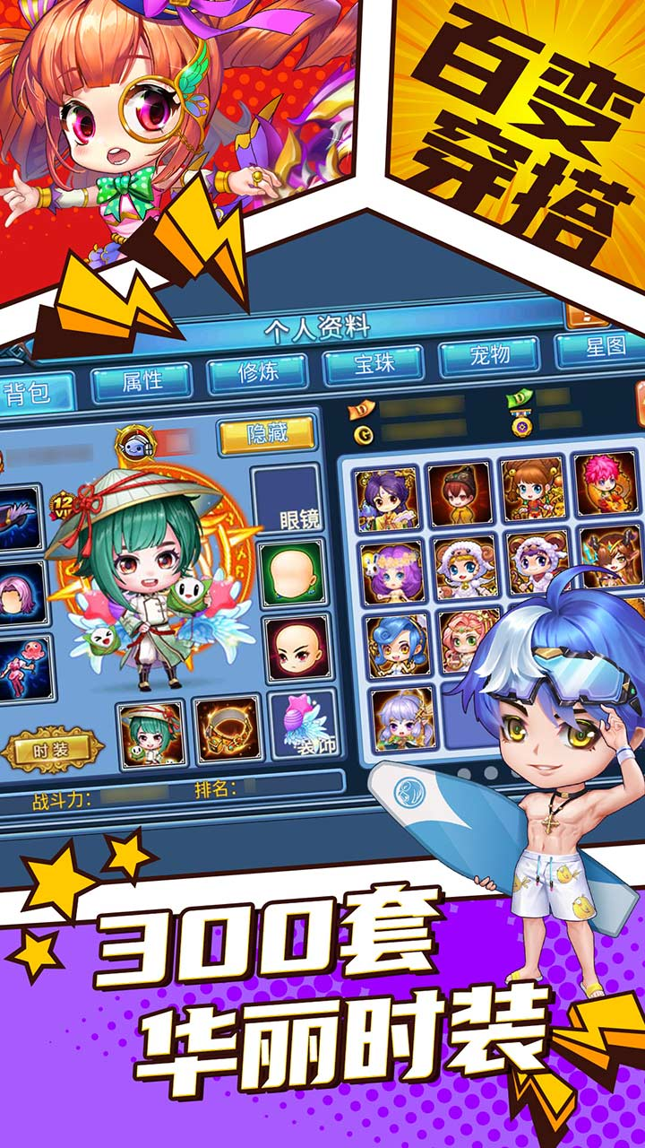 从脸部五官到发型发色定制, 饰品造型随心搭配,300套时装华丽变身,为你刺激的冒险之旅增加别样的趣味!