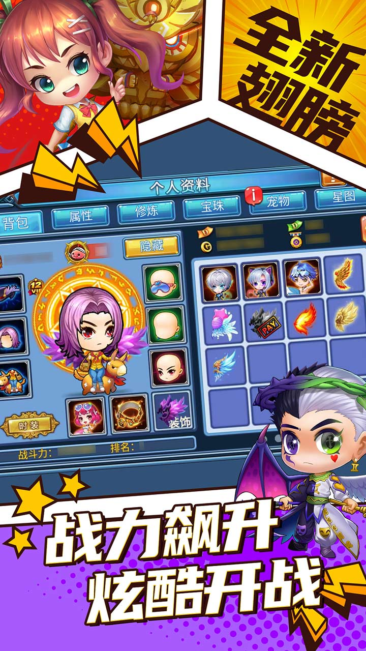 还记得那些年搭档征战的给力小伙伴吗?蓝啵咕,魔蛇,远古大龙,吉比鹿,小毒鸡等20只神兽宠物,还在不断升级!