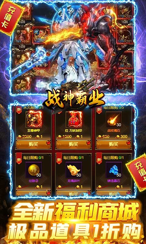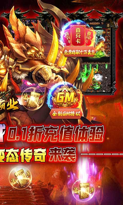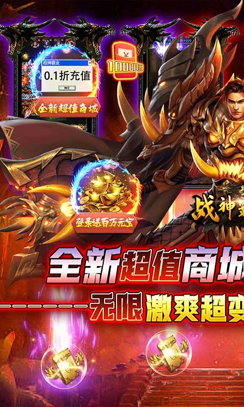 《战神霸业》是一款角色扮演传奇四职业传奇,全新福利升级补贴商场版本来袭!每日1折商城补贴大甩卖,最低0.1折。各大系统装备道具时装均1折上架,先到先得!上线送满vip15,百万元宝,绝版时装套!每日登陆游戏就能免费点充真充,能拿多少全看手速!全新GM商店大改版!全系列的至尊雷霆免费送!终极魔神海神套装免费兑换!轻松养成超百亿GM扶持号!兄弟快上线,真热血pk传奇邀你来战!