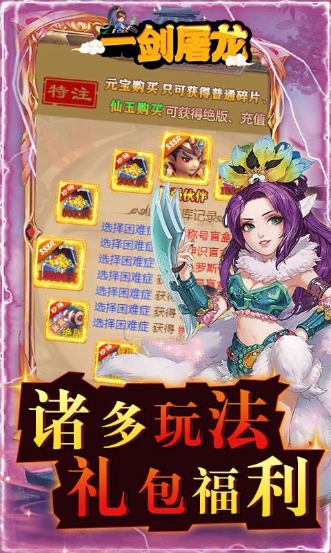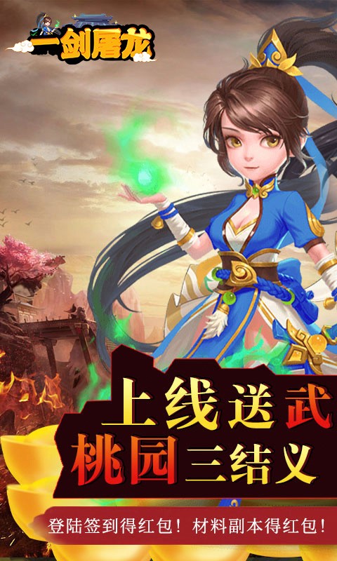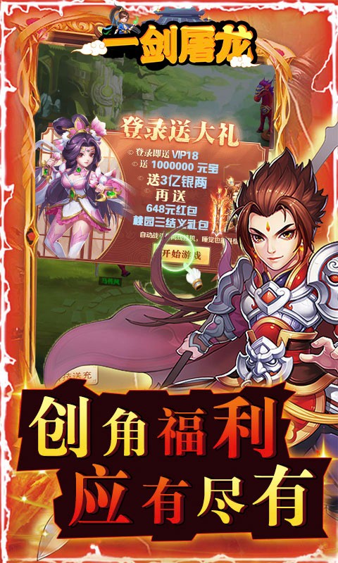 《一剑屠龙(送充送神将)》是一款Q版三国回合制游戏。开局就送VIP18、648元红包、188888金条、100万元宝、3亿银两!精美2D的Q版人物设计,搭配传统三国故事剧情,实力打造精品回合制经典!酷炫坐骑共同潇洒战斗,独有万千道具自由回收,多样经典回合玩法无穷乐趣!还有桃园三结义礼包(内含武将刘关张)免费送,三兄弟齐聚闯天下!